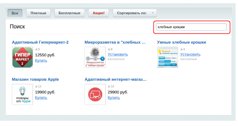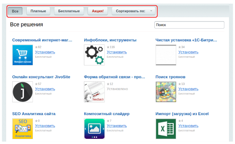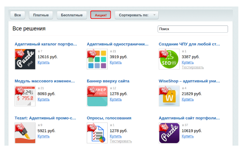 Как вы видите, в Marketplace представлены платные и бесплатные компоненты от различных разработчиков. Кроме того, есть раздел “Акция!”, в котором представлены расширения, которые можно приобрести со скидкой: