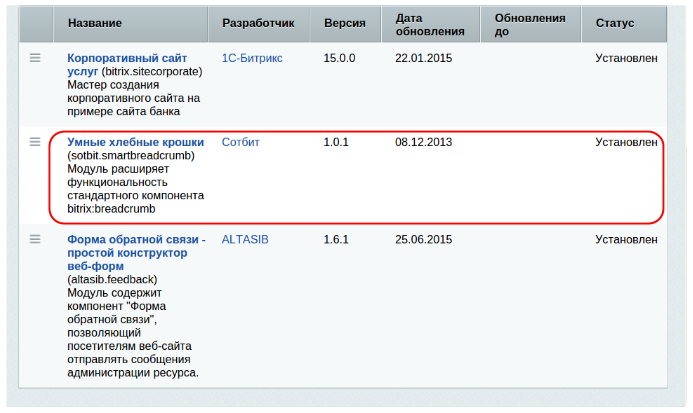 Установленные компоненты находятся здесь: “Администрирование” → Marketplace → “Установленные решения”: