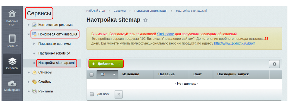 Зайдите  в раздел “Администрирование” → “Сервисы”  → “Поисковая оптимизация” → “Настройка sitemap” → “Добавить”: