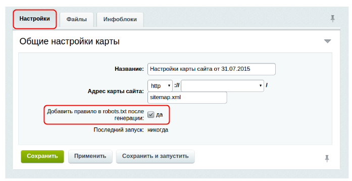Во вкладке “Настройки” ставится галочка напротив пункта “Добавить правило в robots.txt после генерации”: