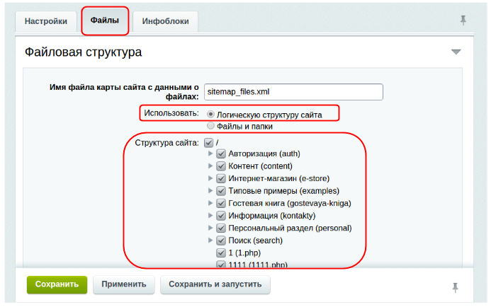 Во вкладке “Файлы” → “Использовать” отметьте “Логическую структуру сайта”. Здесь же поставьте галочку напротив пунктов, которые вы хотите добавить в sitemap.xml: