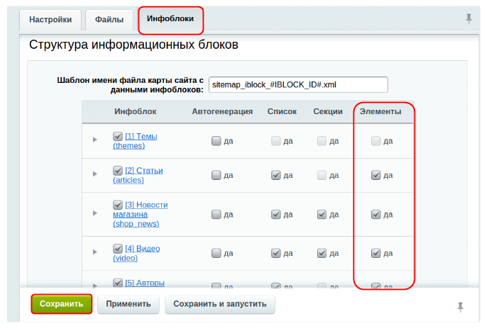 Во вкладке “Инфоблоки” в столбце “Элементы” отметьте те инфоблоки, которые будут добавлены в карту сайта: