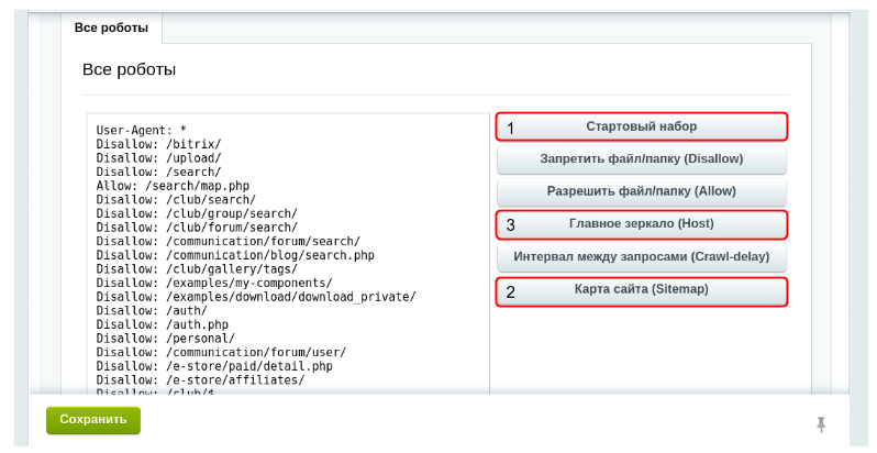Теперь можно переходить к настройке файла robots.txt: “Администрирование” → “Сервисы”  → “Поисковая оптимизация” → “Настройка robots.txt”. В правой части страницы последовательно кликните на на “Стартовый набор” → “Карта сайта” → “Главное зеркало” → “Сохранить”.