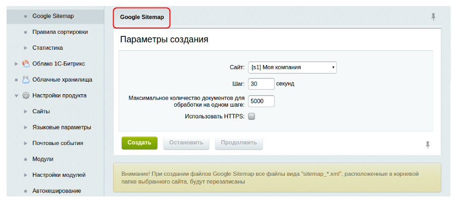 Грамотная SEO-оптимизация Bitrix невозможна без создания карты сайта. Создается sitemap.xml в разделе “Администрирование” → “Настройки” → “Поиск” → Google Sitemap: