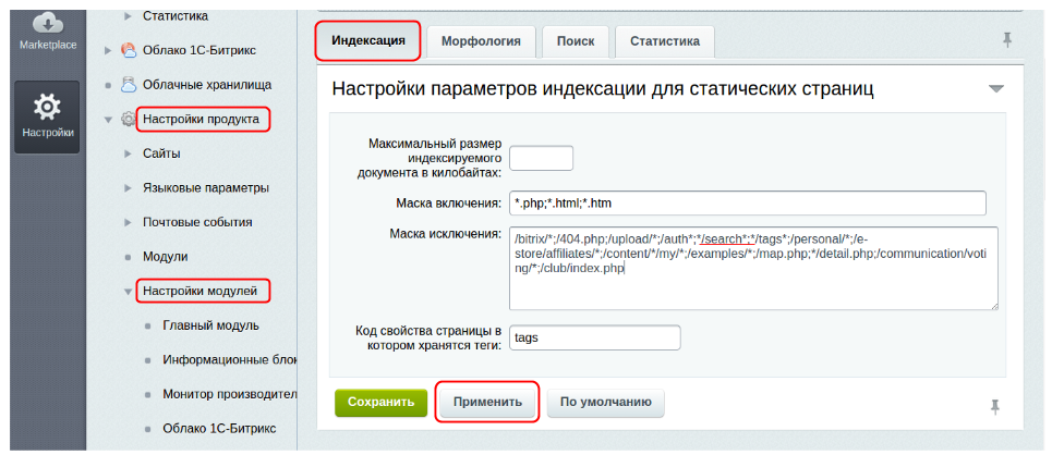 Чтобы настроить карту сайта зайдите в “Настройки” → “Настройка продукта” → “Настройка модулей” → “Поиск” → “Индексация”. Здесь выбираются максимальный размер индексируемого документа в килобайтах, маска включения. Важное поле 一 “Маска исключения”, в нем перечисляются страницы, которые индексировать не нужно. Если вы хотите исключить какой-либо физический раздел, например, поиск (search), пропишите в этом поле следующее и нажмите “Применить”: