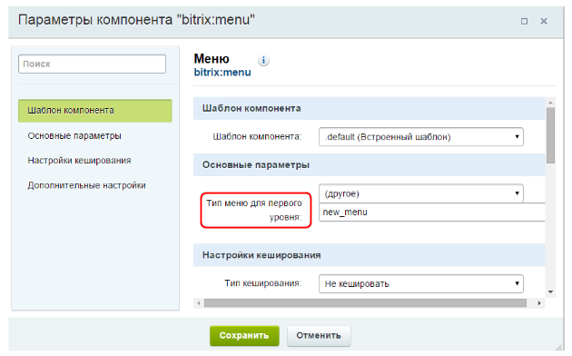 Для настройки компонента кликните по нему дважды. В разделе “Основные параметры” → “Тип меню для первого уровня” выберите “Другое” и впишите название меню и сохраните изменения: