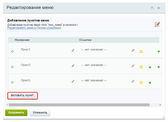 Нажимаем на кнопку “Пункт” столько раз, сколько пунктов меню вы хотите создать: