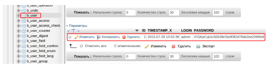 Зайдите в админку хостинга → phpmyadmin → “Базы данных” → БД вашего сайта → b_user:
