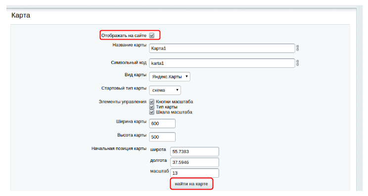 Чтобы добавить карту, перейдите в “Конетент” → “Карты” → “Добавить” . Поставьте галочку напротив пункта “Отображать на сайте”, установите стартовый тип карты, впишите ее название, выберите вид карты (Яндекс/Google), найдите нужный адрес, кликнув на “Найти на карте”: