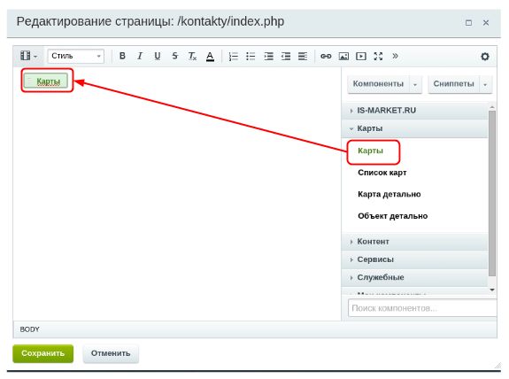 Сохраните изменения и перейдите на вкладку “Сайт”. Найдите раздел, в котором должна появиться карта и откройте режим редактирования и перетащите карту в полу Boby: