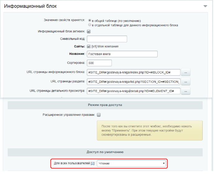 Теперь, когда создана группа для всего контента, касающегося коммуникации с посетителями сайта (обратная форма связи, FAQ и т.д.), можно создать отдельный инфоблок. Впишите название инфоблока, пропишите URL. Во вкладке “Доступ” → “Доступ по умолчанию” → “Для всех пользователей” поставьте режим “Чтение”: