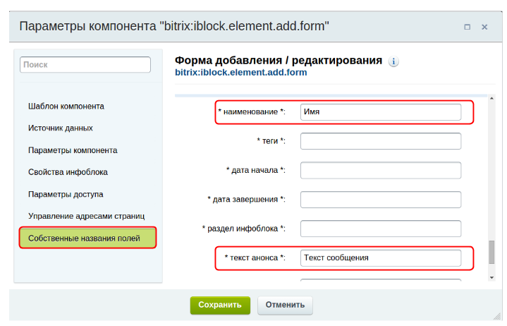 Во вкладке “Свойства инфоблока” отметьте “Наименование”, “Текст анонса”, а затем присвойте этим полям свои названия в соответствующем разделе и нажмите “Сохранить”: