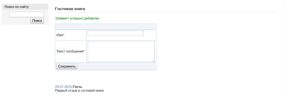 Следующий шаг ― добавление тестой записи, которая отобразится в гостевой книге: “Администрирование” → “Контент” → “Интерактив” → “Гостевая книга” → “Добавить элемент” → “Элемент”. В этом случае “Начало активности” ― дата и время отправки “комментария”, а “Название” ― имя автора. Во вкладке “Анонс” добавляется текст послания: