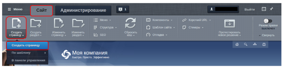 Если говорить о статической информации, раздел можно считать папкой, а страницу ー файлом. Чтобы создать страницу в публичной части, кликните на кнопку “Создать страницу”: