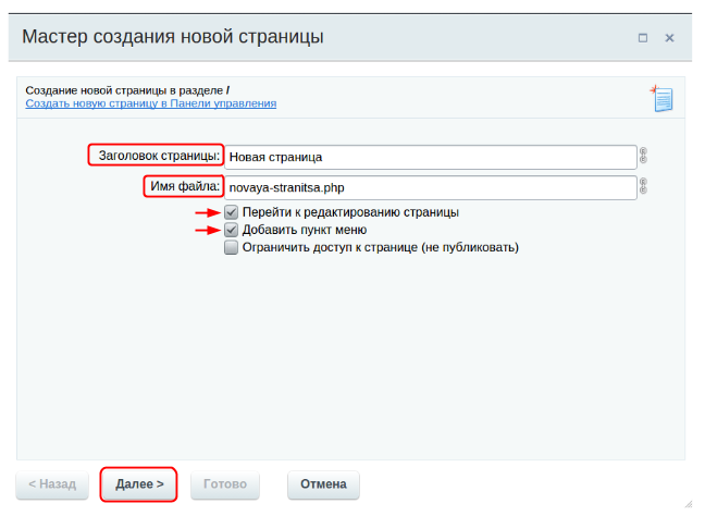 • Если вы снимете галочку с пункта “Перейти к редактированию страницы”, тогда страница создастся пустой.
