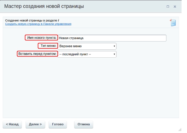 Теперь, когда “Мастер создания новой страницы” запущен, вы можете кликнуть на ссылку “Создать новую страницу в Панели управления” и продолжить работать в панели администрирования: