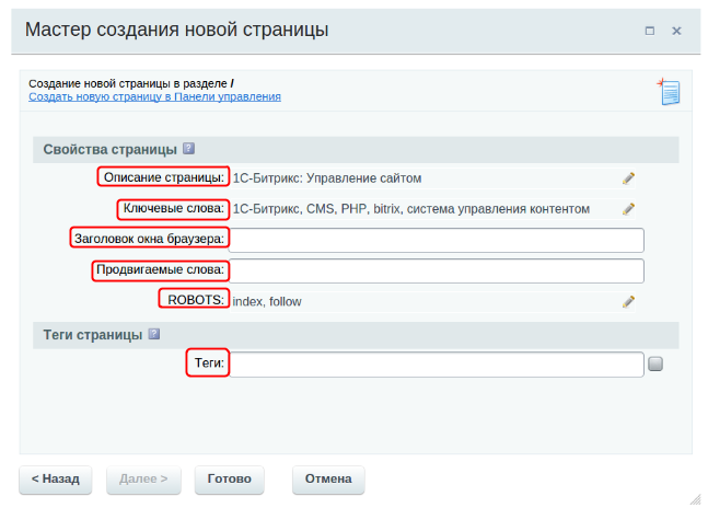 На следующей вкладке заполняются свойства страницы. При необходимости все введенные данные можно поменять. В строке “Описание” дается описание страницы, в строке “Ключевые слова” вписываются слова, необходимые для SEO-оптимизации Bitrix, а в строке “Теги” нужно вписать слова, которые отобразятся в облаке тегов: