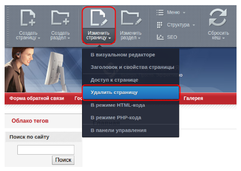 Чтобы удалить страницу откройте ее и кликните на иконку “Изменить страницу” → “Удалить страницу”: