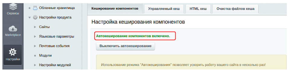 Кэширование ー неизменный помощник в вопросах SEO-оптимизации. Основные настройки кэшировани выполняются в разделе “Администрирование” → “Настройки” → “Настройки продукта” → “Автокэширование”: