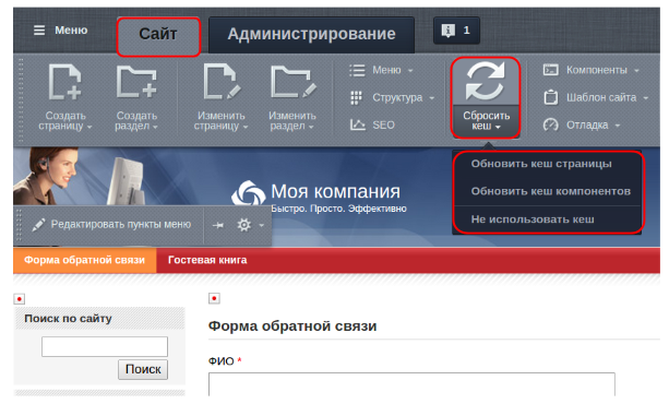 Если вам нужно сбросить/выключить кэш на конкретной странице, зайдите на нее найдите пункт “Сбросить кэш”: